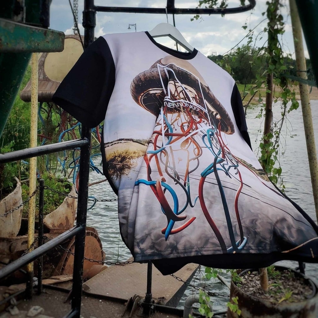 Modernaus stiliaus, unikalūs kultūros laivo-žemkasės „Nemuno7“ marškinėliai, papuošti vienu iš šioje kultūros erdvėje aptinkamų meno kūrinių – jaunosios kartos skulptoriaus Tauro Kensmino „Medūza“ (Martyno Plepio fotografija).